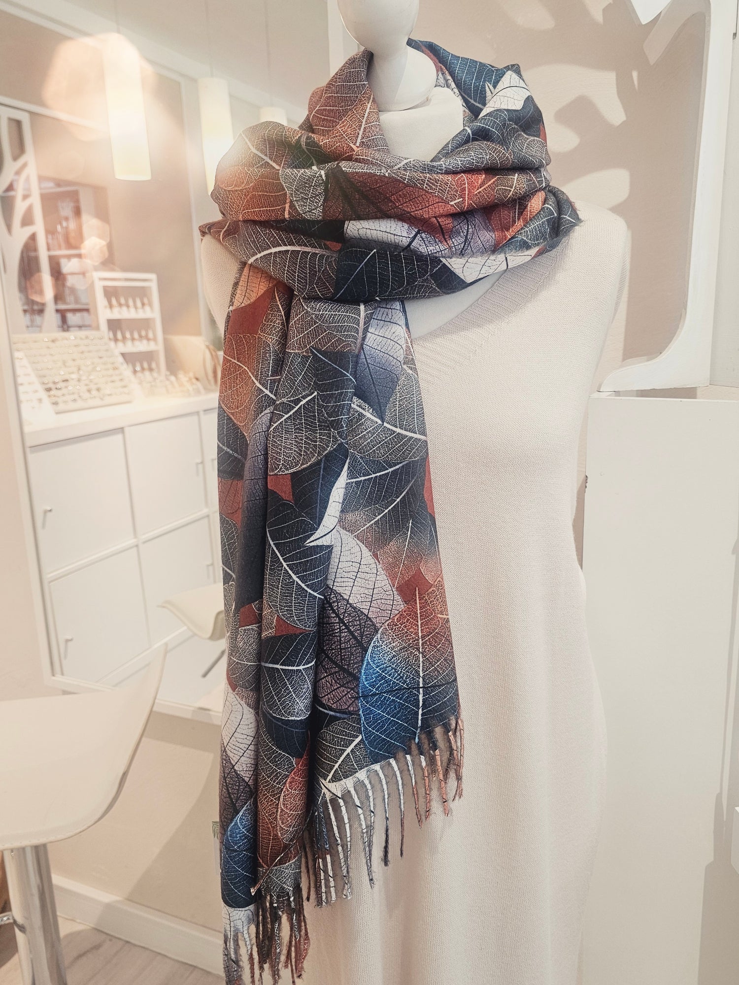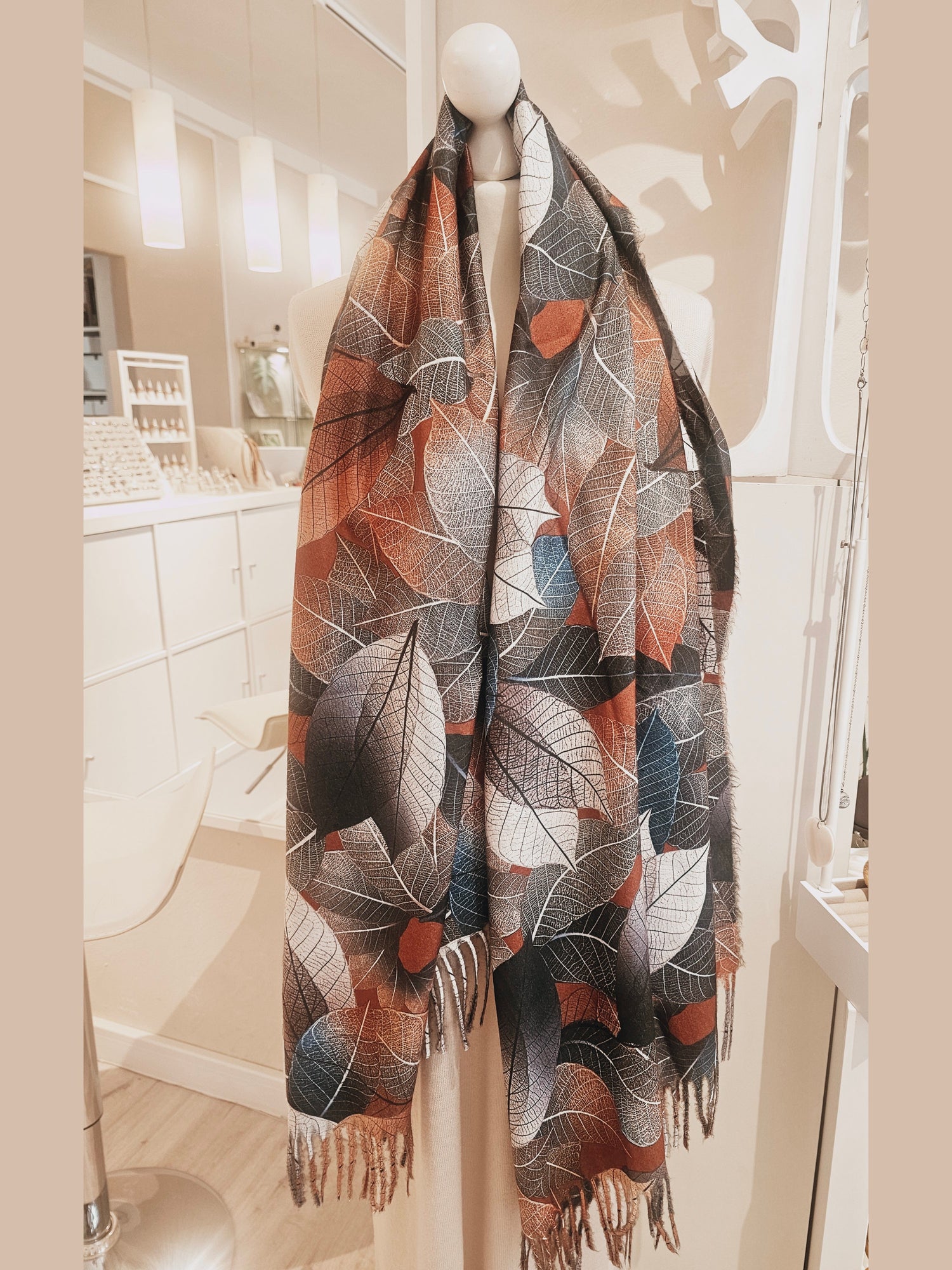 SCHAL Tuch / feiner Jersey / Orange Jeansblau / Blättermuster